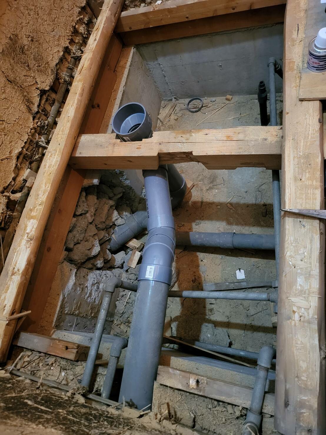 ・配管のやり替えでは、他のトイレ配管との接続バランスを調整。菅勾配に注意しながら施工しました。